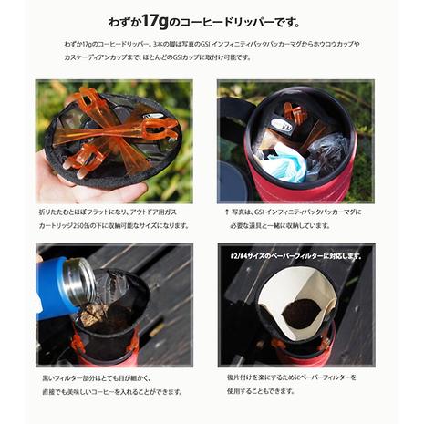 フィルターに付いた3本の脚の先端にあるクリップはマグからシェラカップまでほとんどのカップに取付けでき、登山の際などペーパーレスなのでごみを減らすことにも一役買います。