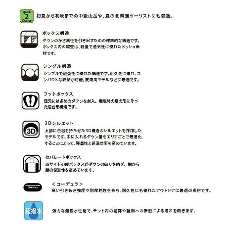 軽量性と保温性能のバランスの優れた、コンパクトな寝袋です。夏のアルプスのテント泊や、春・秋の低山にも最適です。