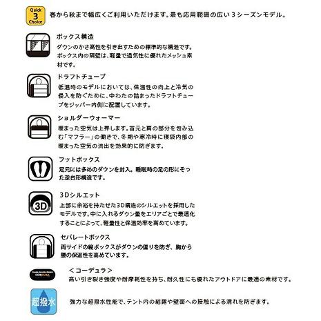 夏山から冬の低山まで、幅広く対応できるスリーシーズンモデルです。春秋の3000mクラスには特におすすめします。セパレートボックス構造を採用し、胸元の保温性を向上させています。最高品質のグースダウンを450g封入しています。