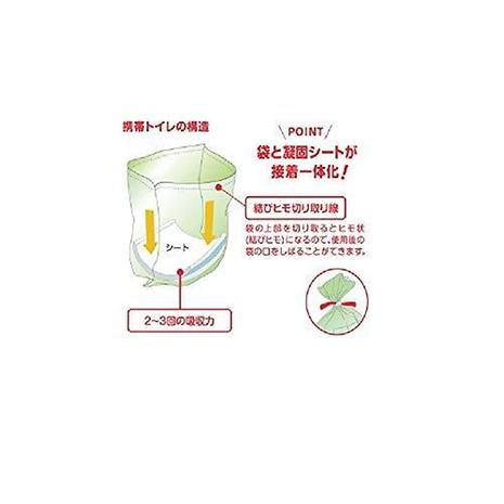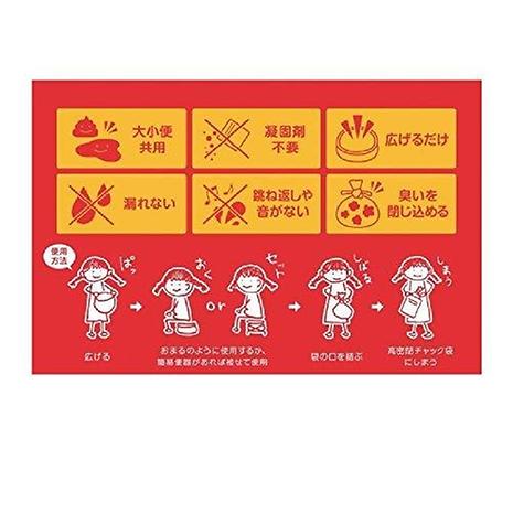 いざという時に役立つ携帯トイレ 便袋1枚/高密閉チャック袋1枚入った携帯トイレ。 いざという非常時用やアウトドアでご利用いただけます。 特殊のシートが水分を素早く固めます。においや内容物を漏らさない超防臭チャック袋付です。 ・セット内容:ECOサニタクリーン便袋1枚、高密閉チャック袋1枚、水溶性ポケットティッシュ1個 ・収納サイズ:143×290mm ・使用方法:1、商品を広げる。2、おまるのように使用するか、簡易便器があれば被せて使用。3、袋の口を結ぶ。4、高密度チャック袋にしまう。 ・商品特長:【 内閣官房 日本トイレ大賞 受賞 】「登山にはカワイイ物"を持っていきたい」といった山ガールの声で開発された、使いやすさ、機能性、デザインにこだわった「女性向け携帯トイレ」です。 ・使用素材について:カーボンニュートラルに貢献するためにバイオマスプラを使用。商品パッケージの特長:袋にイラストと8か国語で表記。外国の方でも分かりやすい。