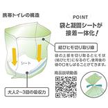 高速給水凝固シートを使用した携帯トイレです。特殊のシートが水分を素早く固めます。においや内容物を漏らさない超防臭チャック袋付です。登山、マリンスポーツなどのアウトドアシーンからキャンピングカーのトイレ、おむつの一時保管などで活躍します。袋に吸収シートが一体化されているので、開くだけですぐに使えるシンプルな構造です。
