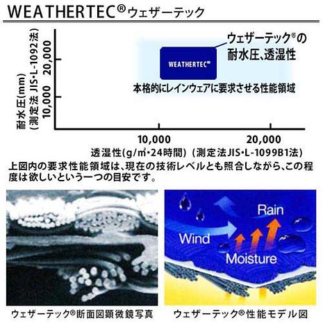 ウェザ−テック(R)は、特殊な樹脂の無孔質(穴のない)メンブレン(薄膜)を2枚の生地でサンドウィッチ構成した3層構造の高機能素材です。特に防水性能、防風性能、透湿性能、結露防止性能に非常に優れており、この性能は洗濯後も継続してくれる性質を持っています。登山、トレッキングはもちろん、さまざまなアウトドアでの雨、風、雪のシ−ンに最適な素材です。