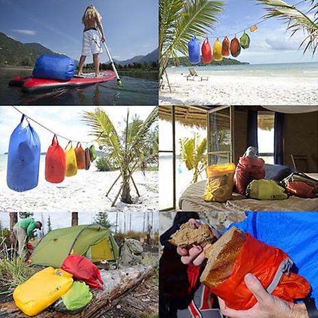 外側にシリコンコーティング、内側にPUコーティングを施した15Dリップストップナイロン製のロールトップクロージャー付き超軽量防水ドライバッグ。