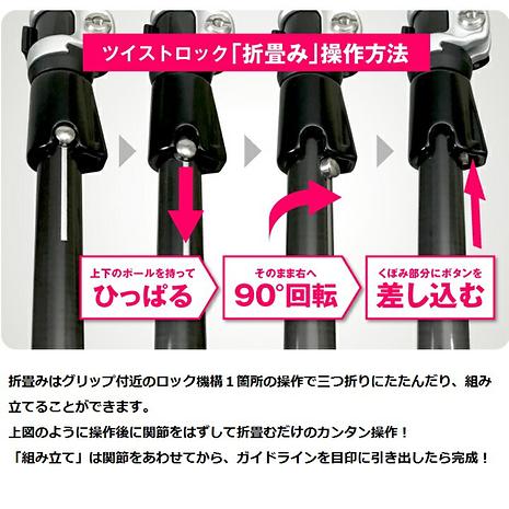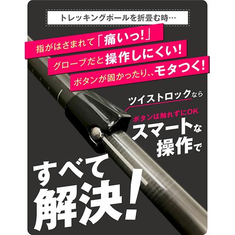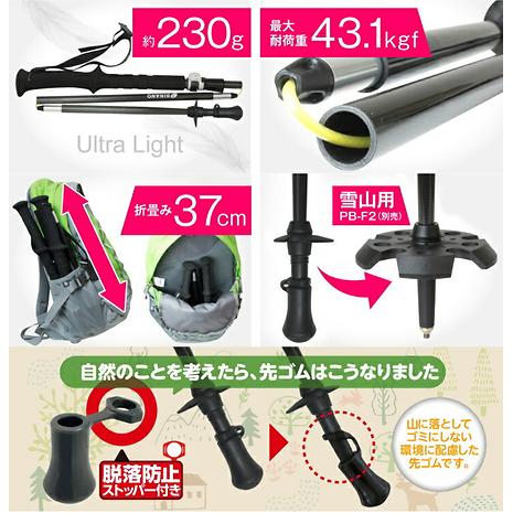 カーボンシャフトと軽量ストラップによる驚きの軽さと、独自の強度設計により本格的なトレッキングに耐える安心の強度を実現。
