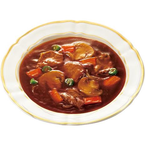 牛肉(オーストラリア)、マッシュルーム、オニオンソテー、ハヤシルウ、加工黒糖液、ビーフエキス調味料、にんじん、さやいんげん、オニオンエキス、植物油脂、果実酒、ビーフエキス、ローストオニオンペースト、クリーム、脱脂粉乳、発酵調味料、トマトペースト、香辛料、ブイヨン風調味料、食塩、フォンドヴォー、還元水あめ、酵母エキスパウダー/増粘剤(加エデンプン)、甘味料(トレハロース)、調味料(アミノ酸等)、カラメル色素、酸味料、重曹、酸化防止剤(ビタミンE、ビタミンC)、香辛料抽出物、(一部に小麦・乳成分・牛肉・大豆・鶏肉・豚肉・ゼラチンを含む)