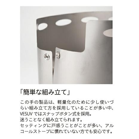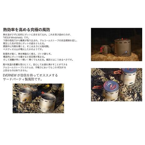 風や気温の影響を受け難く安心してお湯を沸かす事が出来るアルコールストーブシステムは、手軽さにおいてもこのVESUVを上回るものはありません。EVERNEWが自信をもってオススメするサードパーティー製風防です。