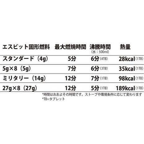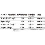 ・水:約500mlを約5分で沸騰(ストーブや環境条件に応じて変わります。)