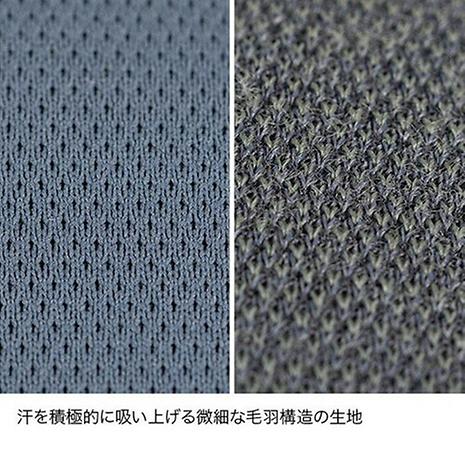 メリノウール本来の保温・調湿性と高機能ポリエステルの吸汗速乾加工を兼ね備えているため、蒸れにくく汗を素早く乾かします。