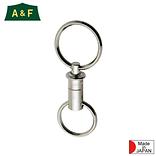 A&F エイアンドエフ キーリリースはNASAの宇宙開発技術によってつくられたもので、200kgもの引張りにも耐えられます。突起を軽く押して引き抜くとリングが別々に外れるのでエンジンキーとトランクキー、ガレージキーと玄関キーのように2種類のキーをまとめて持ち歩け、必要に応じて別々に機能させることが出来ます。また、別売りのキーバックなどに車のキーを付けておくときも簡単に外すことができ大変便利です。