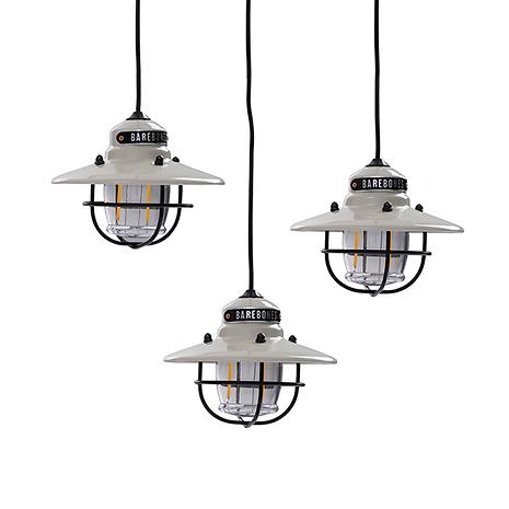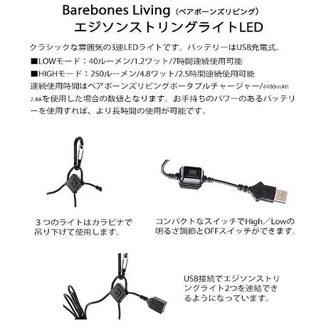 Barebones ベアボーンズ エジソンストリングライトLEDはエジソンタイプのLEDを採用し、ベアボーンズ製バッテリーやその他のUSB-ACアダプターやUSBバッテリーなどのUSB電源で使用が可能なペンダントライトが3つ繋がったライトです。ハイ、ローモードの光量の選択が可能です。