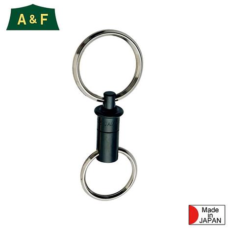 A&F エイアンドエフ キーリリースはNASAの宇宙開発技術によってつくられたもので、200kgもの引張りにも耐えられます。突起を軽く押して引き抜くとリングが別々に外れるのでエンジンキーとトランクキー、ガレージキーと玄関キーのように2種類のキーをまとめて持ち歩け、必要に応じて別々に機能させることが出来ます。また、別売りのキーバックなどに車のキーを付けておくときも簡単に外すことができ大変便利です。