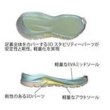足裏全体を包み込むようにカバーする『3Dスタビリティーパーツ』が足の安定感と安全性を確保し、靴自体の剛性を高めています。ミッドソールにはクッション性と衝撃吸収性に優れた、ボリューム感のあるEVAミッドソールを採用。インソールにも高通気性と高クッション性に優れた、カップ形状のインソールを新たに採用しました。