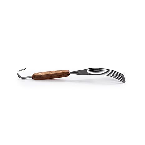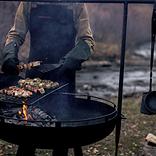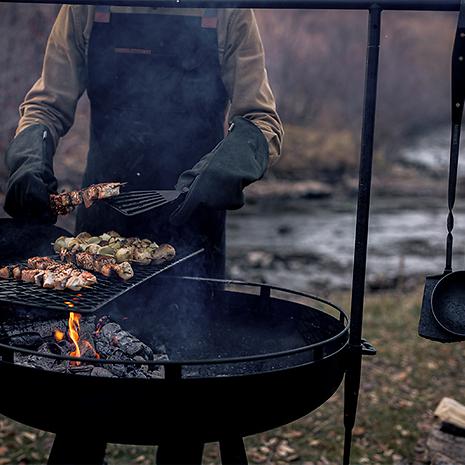 カウボーイファイヤーピット グリル-30"で吊り下げて使用できるように設計されています。職人の手で鍛造されたステンレス鋼で、滑らかで自然なクルミ材のハンドルが付いています。