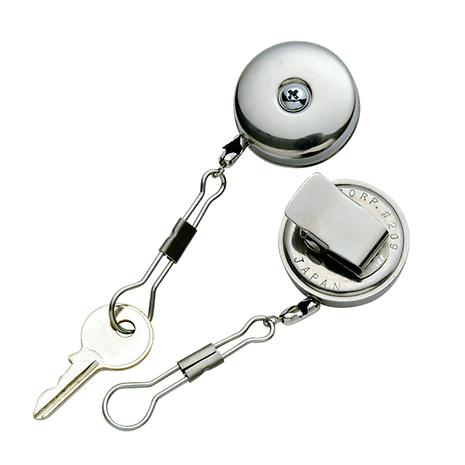 A&F エイアンドエフ クリップオンリールはスプリングの力により引き出した紐が、自動巻取りします。クリップ式でどこでも取り付けられ、好みの道具を先に付け便利に使えます。錆びに強いオールステンレス製です。