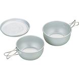 アルミ製で非常に軽くコストパフォーマンスに優れる。個人用の器として使用するボールセットです。いざとなれば直接火にかける事も出来ますが、ハンドルもアルミ製ですので注意が必要です。