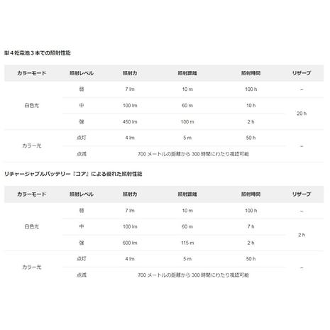 -電源を感知することで、電源に応じて照射性能が調節されます。リチャージャブルバッテリー『コア』を使用した場合により明るく照射され (「強」モードで最大600 ルーメン)、また明るさは使用時間を通してより均一に保たれます