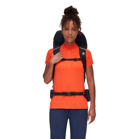 チャレンジ精神でハイキングに挑む。そのためにはバックパックにもそれなりの収納力が欠かせません。Lithium 40 Womenは,主にリサイクル素材を使用し,PFCフリーの耐久撥水加工を施しています。キャリングシステムとショルダーストラップは女性の体型に合ったデザイン。背面長は調整が可能です。アナトミカルシェイプのソフトなパッド入りヒップベルトとショルダーストラップで快適さが向上。ヒップベルトは取り外しができます。一体型レインカバーと同じく取り外しが可能。ボトムコンパートメントは、外からも直接アクセスできます。トレッキングポールやピッケルをしっかり固定するアタッチメントも付属。装備の持ち運びにはコンプレッションストラップを使用できます。歩きながらでも出し入れが簡単なサイドのメッシュポケットも便利。ハイドレーションシステムにも対応しています。タフなツアーで使いこなせる,収納力抜群のパートナーです。