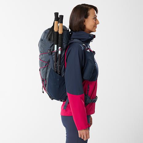 低山の山小屋泊山行からミニマルなファストパッキングといった軽量装備での軽快なハイク&ランに最適、高い機動力と機能性を兼ね備えた軽量バックパックです。ミニマルでクリーンな外観のボディには軽量かつ高耐久な100デニールのダイアモンドロビックナイロンを採用。高い通気性と安定した背負い心地を実現した背面システムは、暖かい時期のアクティブな旅での快適性を提供します。雨蓋とフロントジッパーどちらからもアクセスできるメイン収納はパッキングや出し入れも楽々。サイドには便利なメッシュストレッチポケット、外側にはデイジーチェーンとバックル留めのバンジーコードによってシンプルながら汎用性の高い収納を実現しています。この女性向けモデルでは女性の体型に合わせて背面長やストラップの形状などを調整しています。28リットルは日帰り登山から小屋泊まり、軽量装備のテント泊など、工夫次第で幅広い山行に適応する汎用性の高いサイズ。ハイキングはもちろん、ファストパッキングやヴィアフェラータ、サイクリングなど軽快さを楽しむ多様なアクティビティに対応します。