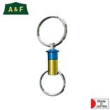 A&F エイアンドエフ アルミキーリリースは軽いアルミで作った便利なキーリリースです。美しいアルマイトカラー仕上げで、色分けで鍵別に使用すれば、一目瞭然です。また、NASAの宇宙開発技術によってつくられたもので、200kgもの引張りにも耐えられます。突起を軽く押して引き抜くとリングが別々に外れるのでエンジンキーとトランクキー、ガレージキーと玄関キーのように2種類のキーをまとめて持ち歩け、必要に応じて別々に機能させることが出来ます。また、別売りのキーバックなどに車のキーを付けておくときも簡単に外すことができ大変便利です。