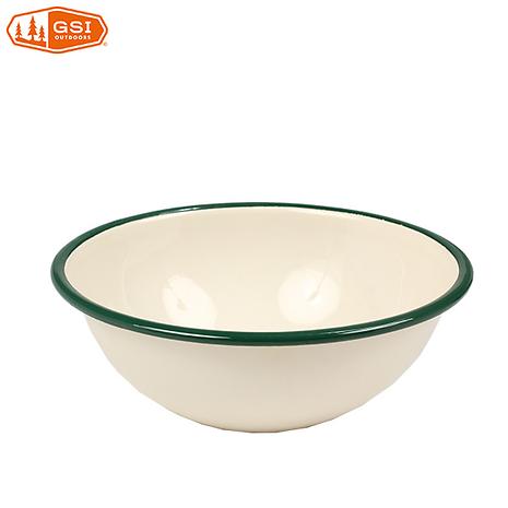 GSI ジーエスアイ デラックスエナメル ボウル クリームは100年以上昔から愛され続けている、強固で美しいホーロー食器の新色です。ホーロー部分は厚みのある鉄板にガラス質釉薬を2回キルン硬化させたエナメルコートを施すことにより、欠けや傷、汚れに強くなっております。こちらの新色はかわいらしいクリーム色をベースにグリーンがアクセントとなっており、人気のアースカラーや、ウッドファニチャー等と相性抜群です。底がラウンドしている深さのある食器ですので、サラダやあえ物などにおすすめです。※こちらはステンレスリムが付いていない商品となります。