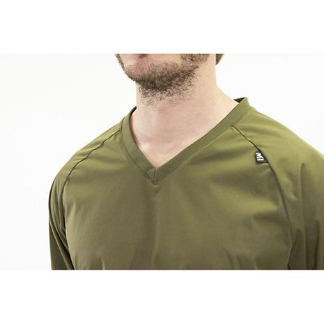 衿はより空気の移動を促進しやすいVネック仕様。左右にジッパーサイドポケットを配置しアウターとしての使い勝手は十分。