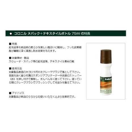 起毛皮革を新品時の柔らかな風合いに維持し、フッ化炭素樹脂が繊維に深く浸透し防水効果を与えます。色付きのローションは高い浸透効果によって色を再生します。