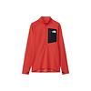 生地は、肌面にはっ水加工を施したドライ層を用い、表面は汗を素早く拡散し乾燥させる吸水層で構成したダブルフェイス構造。汗をかいても肌面のドライ層からドット上の接結面を通じて、スムーズに生地表面に吸水し移行させて乾燥を促します。 ややタイトなフィット感ながらダイナミックな動きにしっかり追従する立体パターンを用い、適度な保温効果も発揮。袖口はサムホール仕様。胸ポケットにはストレッチ生地を用い、スマートフォンや地図などを楽に収納できます。首を日焼けやロープから守る高い襟のジップアップ仕様です。