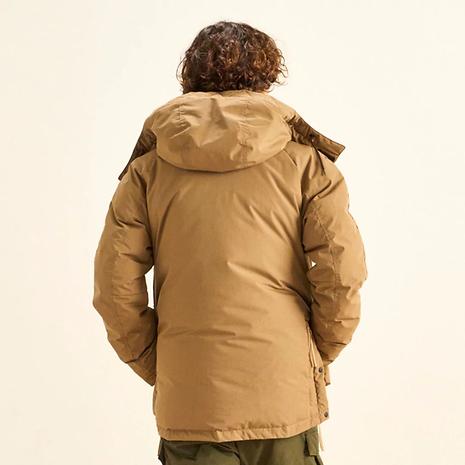 コットンライクなポリエステル生地に難燃素材アラミドを配合したNANGA独自のタキビ生地をメインファブリックに採用し、NANGAダウンの高い保温性を感じながら、化学繊維の弱点である”焚き火”を楽しむことが出来る1着になっております。