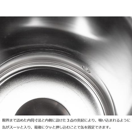限界まで詰めた内筒寸法と内側に設けた3点の突起により、吸い込まれるように缶がスーッと入り、最後にクッと押し込むことで缶を固定できます。