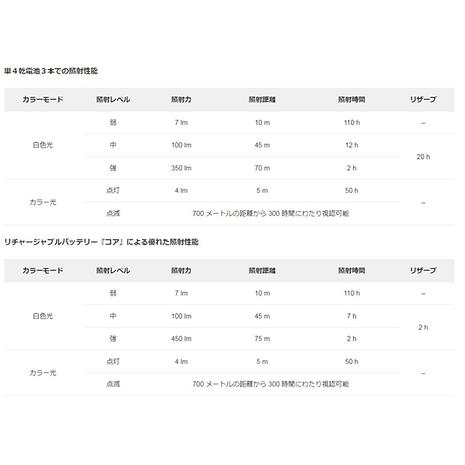 -電源を感知することで、電源に応じて照射性能が調節されます。リチャージャブルバッテリー『コア』を使用した場合により明るく照射され (「強」モードで最大 450 ルーメン)、また明るさは使用時間を通してより均一に保たれます