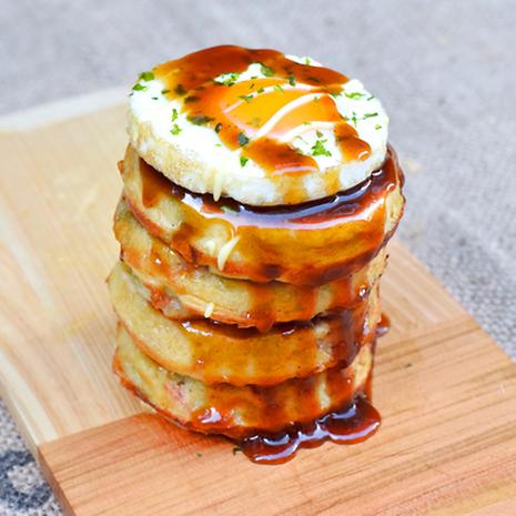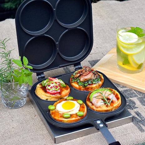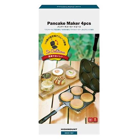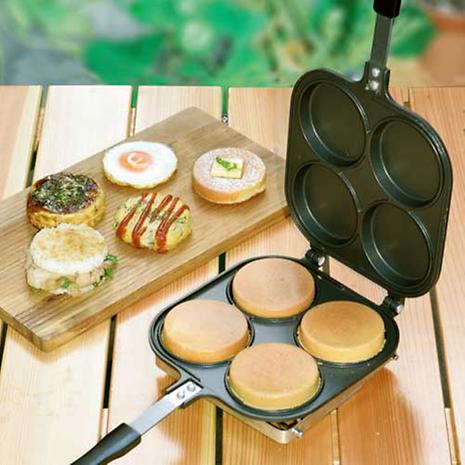 4枚のミニパンケーキが1度に焼けるクッカー。目玉焼きやお好み焼き、ライスバーガーなどアイデア次第で多彩なアレンジが楽しめます。