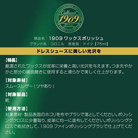 対象素材・製品表面のホコリを布やブラシで落としてください。ポリッシングクロスに少量取り、皮革に均一に塗布してください。ポリッシングクロスで乾拭きして、1909ファインポリッシングブラシで仕上げてください。