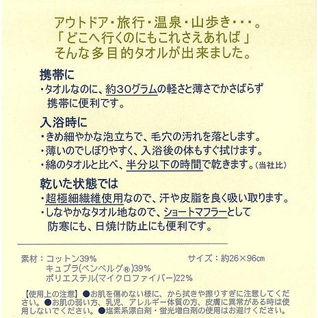 このタオルに織り込まれているコットンとマイクロファイバーが、お肌の皮脂を汗とともにやさしく拭き取ってくれます。また約30gと超軽量なので持ち運びやすくてかさばらず、コットン100%のタオルと比べて半分の時間で乾く速乾性もあり、マルチに使えるタオルです。