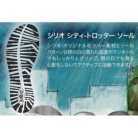 アウトドアで培われたシリオの技術がつぎ込まれ、シリオオリジナル・ラバーと専用パターン「シティ トロッター ソール」を装備。