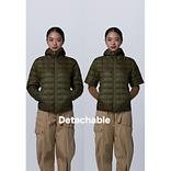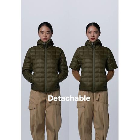 袖detachable仕様のノーカラーダウンパーカー