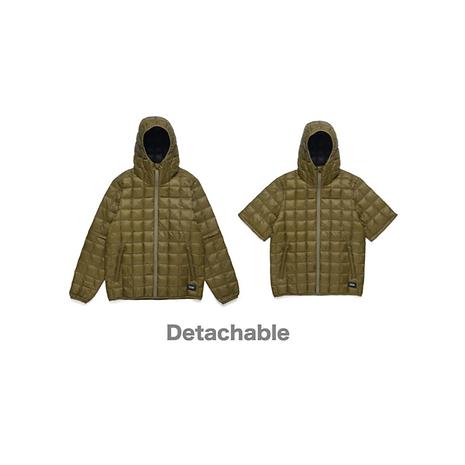 タウンユースではシンプルなインナーダウンパーカーとして、汎用性が広く、アウトドアシーンでは、袖を取り外す事で可動域を広げる事により、アクティブに行動できる仕様になっています。